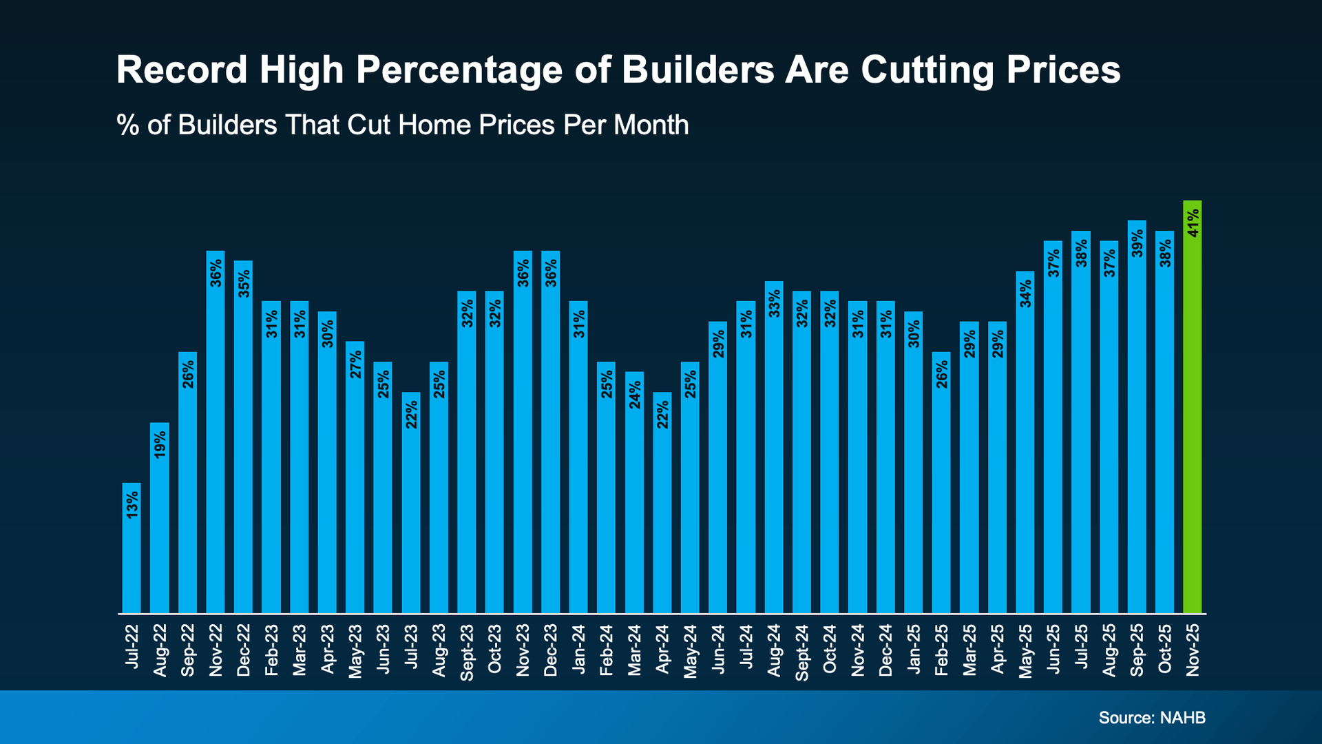 “. . . 41% of builders reported cutting prices in November, a record high in the post-Covid period and the first time this measure has passed 40%.”